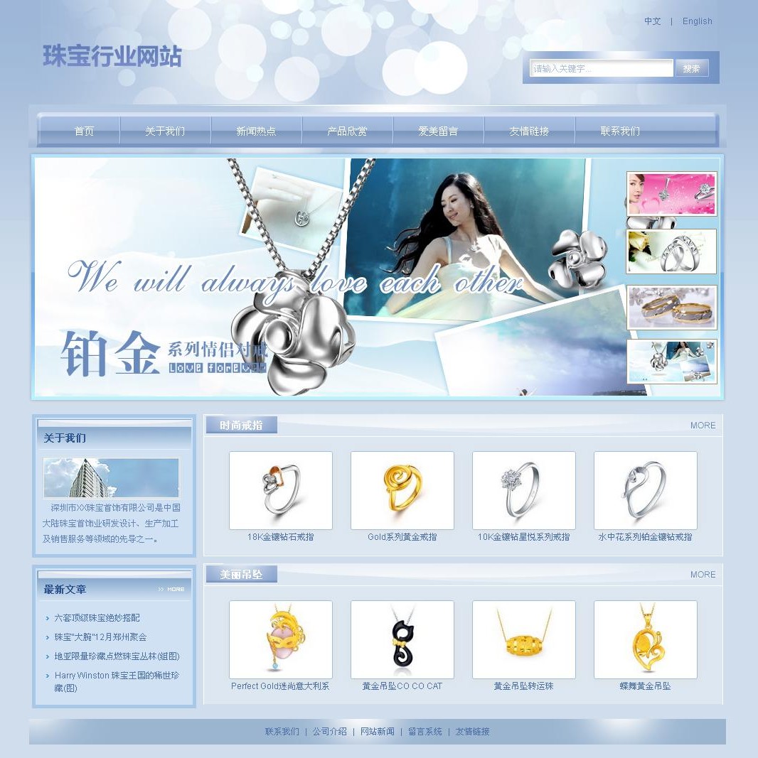 彈指一揮間,十年磨一劍,憑借著全面發(fā)展的綜合實力,憑借著不斷創(chuàng)新的設計研發(fā)、嚴格優(yōu)質的質量保證、親切貼心的銷售服務,XX珠寶取得了彪炳業(yè) 績,獲得了“中國馳名商標”、“中國名牌”、“中國珠寶首飾業(yè)名牌企業(yè)”、“廣東省著名商標”、“廣東省名牌產品”等榮譽稱號和廣大消費者的青睞和好評。 XX公司在珠寶業(yè)界已經奠定了領先的地位,擁有了廣闊的發(fā)展空間和優(yōu)勢資源。